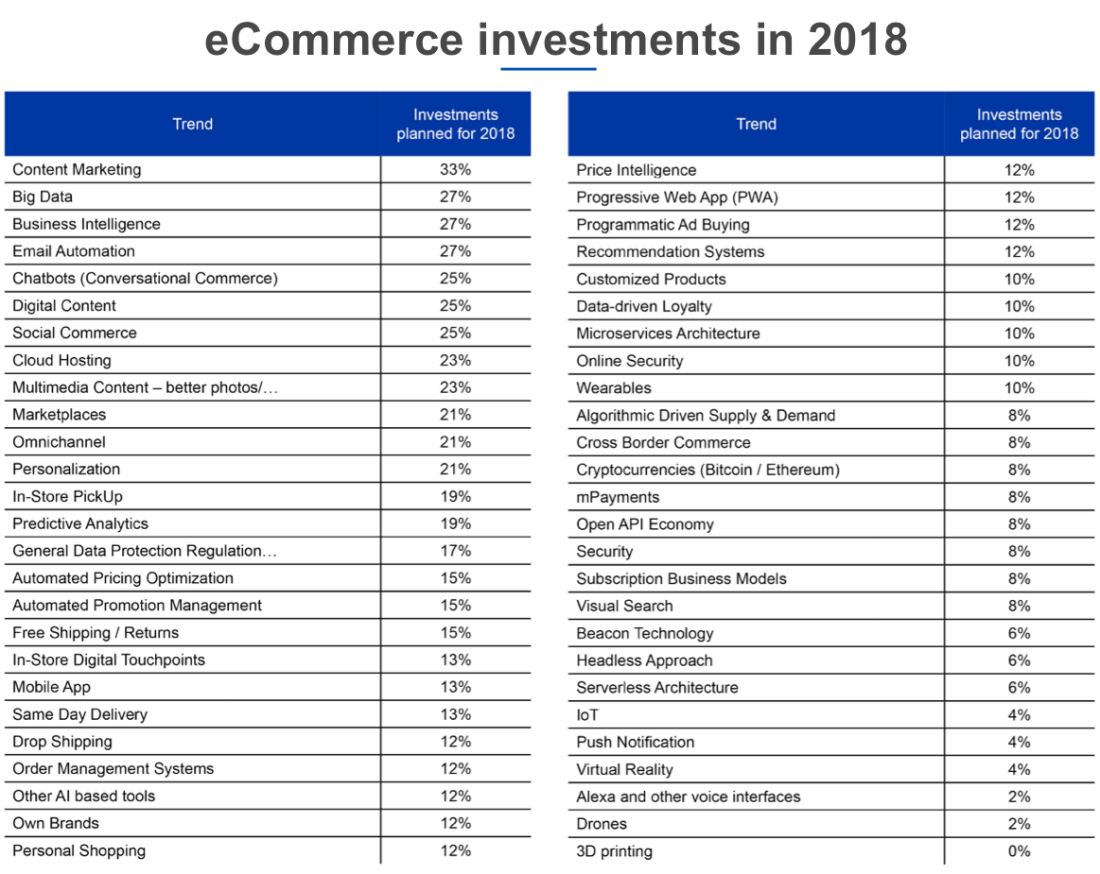 ซึ่งการเลือกลงทุนในเทคโนโลยีต้องขึ้นอยู่กับลักษณะธุรกิจ และกลยุทธ์ของแต่ละบริษัท อย่างไรก็ตาม ผู้ประกอบการอีคอมเมิร์ซเองก็ควรจะติดตาม และทำความเข้าใจกับเทคโนโลยีที่เกิดขึ้นอยู่เสมอ พร้อมทั้งวิเคราะห์ถึงผลกระทบที่มีกับธุรกิจทั้งในปัจจุบัน และอนาคต โดยการนำเทคโนโลยีมาปรับใช้นั้น หากธุรกิจเองไม่ได้มีความเชี่ยวชาญด้านนี้ อาจจะมองหาพาร์ทเนอร์ร่วมที่มีความเชี่ยวชาญด้านเทคโนโลยีอย่างสตาร์ทอัพก็เป็นอีกหนึ่งทางเลือกที่น่าสนใจครับ