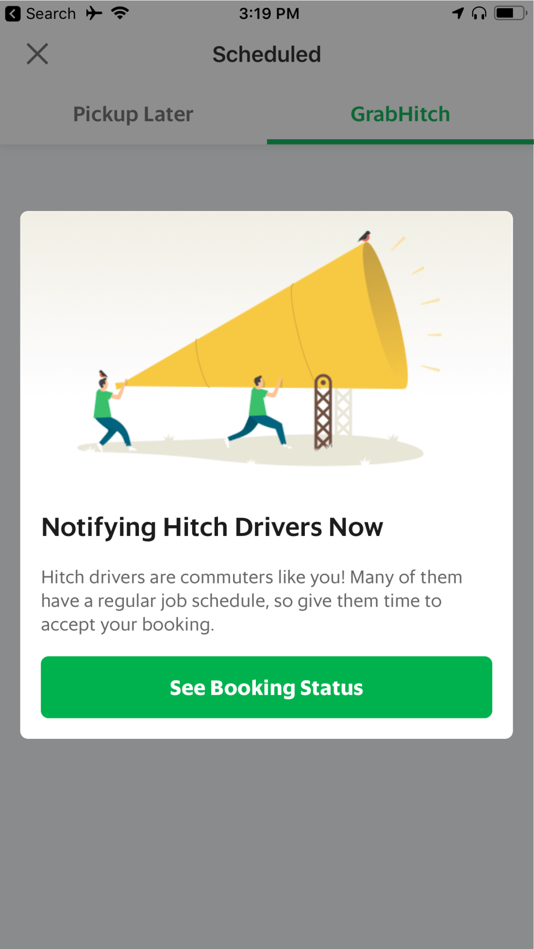 Grab Hitch คือตัวที่สนใจสุด ตอนแรกจองอันนี้ แต่พบว่าไม่มีคนตอบรับ เข้าใจว่าน่าจะเป็นโมเดล Car Pool นั่นเอง